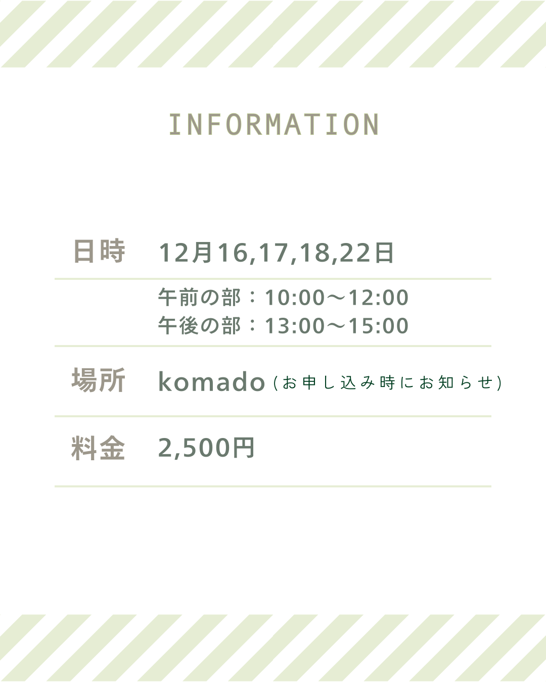 少し急ではありますが、今月お手当て会を開催したいと思います。年末でお忙しい時期とは思いますが、一年の疲れを取りにぜひいらしてください。